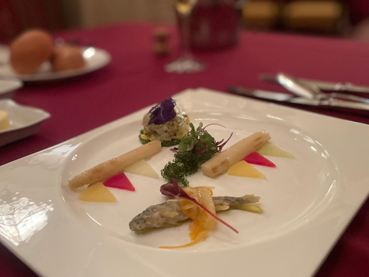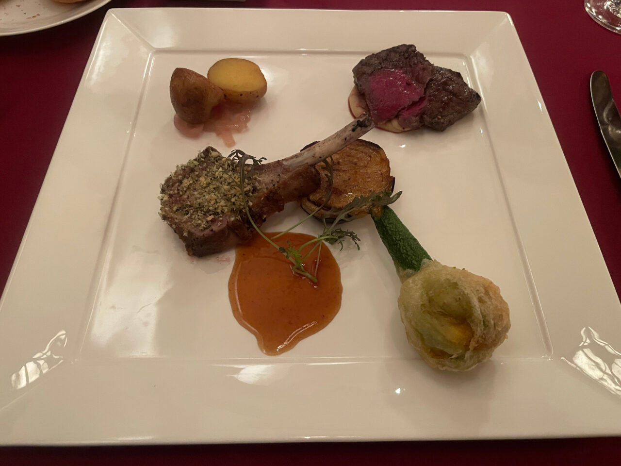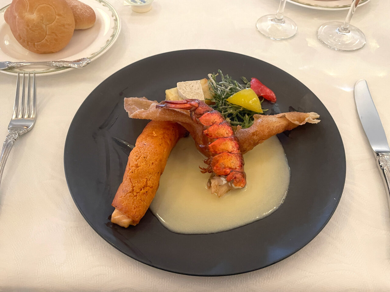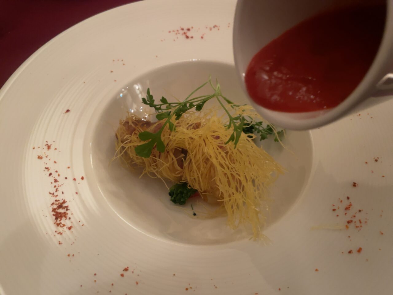 サーモンの桜海老クルート焼きとオマール海老のオーブン焼き、シュリンプのパートブリック包み添え