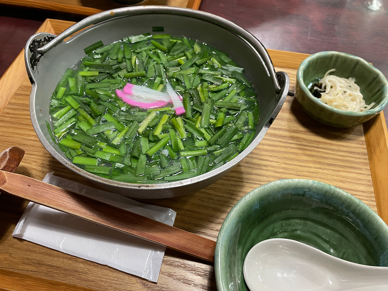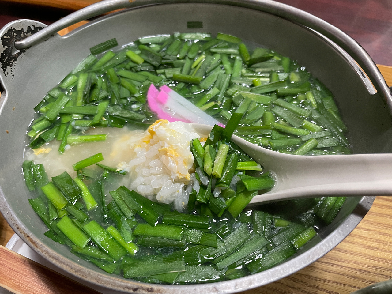 にら雑炊は鍋いっぱいにニラが広がっていて、見た目のインパクトがあります。