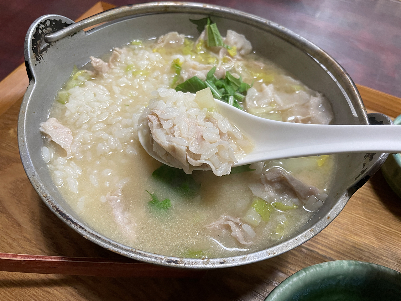 味噌味の豚雑炊は、豚肉の旨みと味噌のコクがしっかり感じられる味でした。