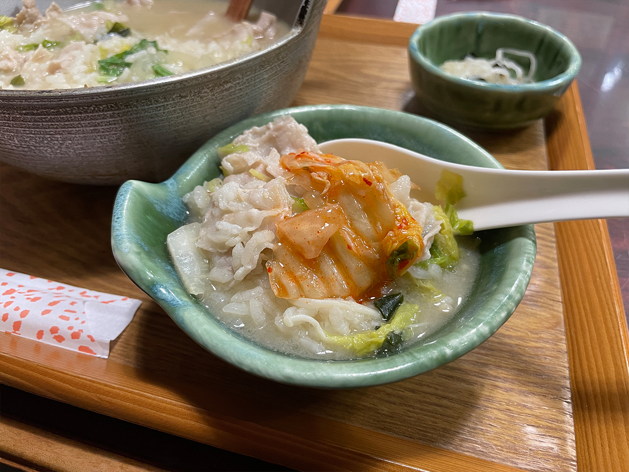 今回は、にら雑炊と味噌味の豚雑炊をいただきました。