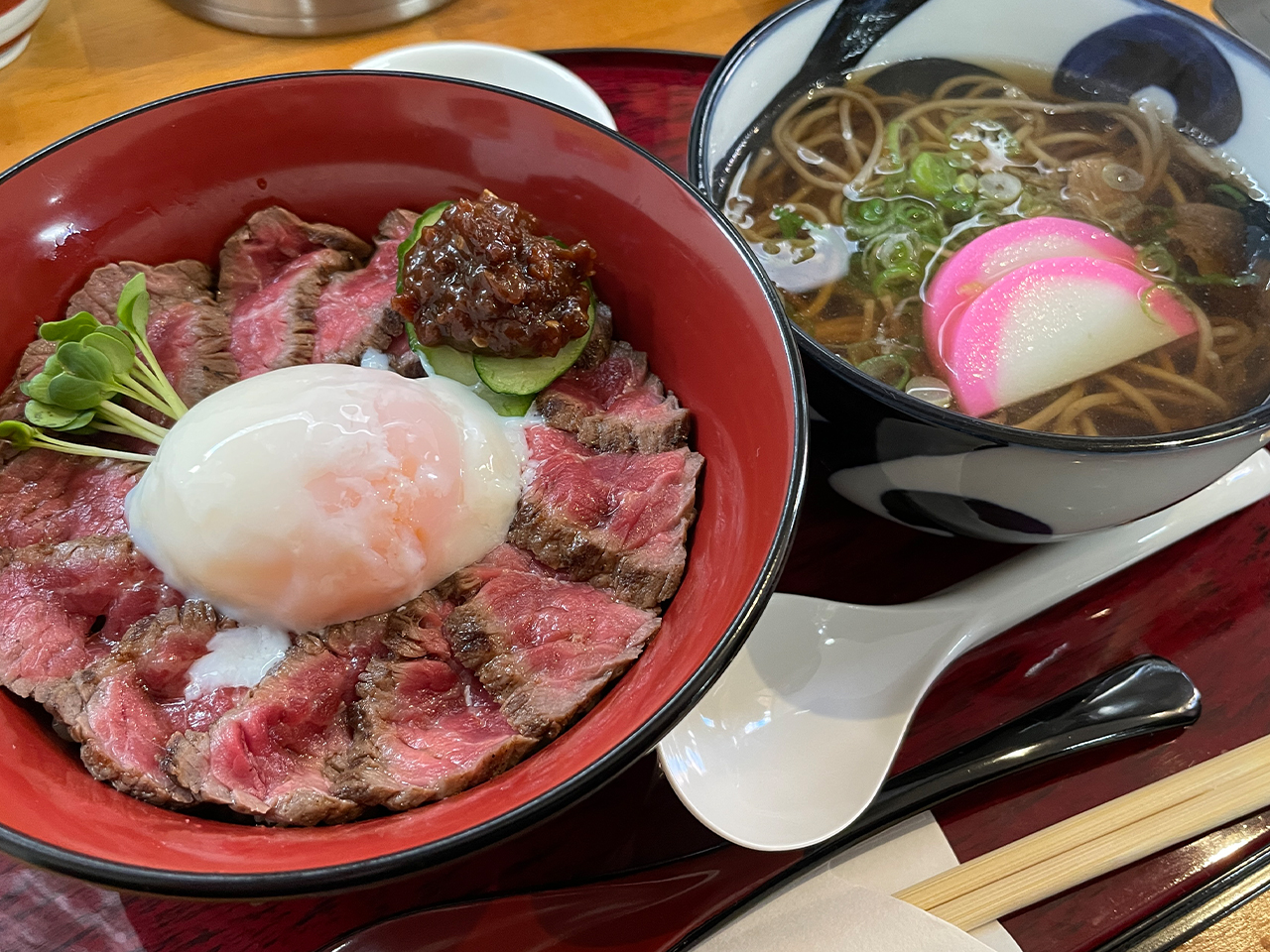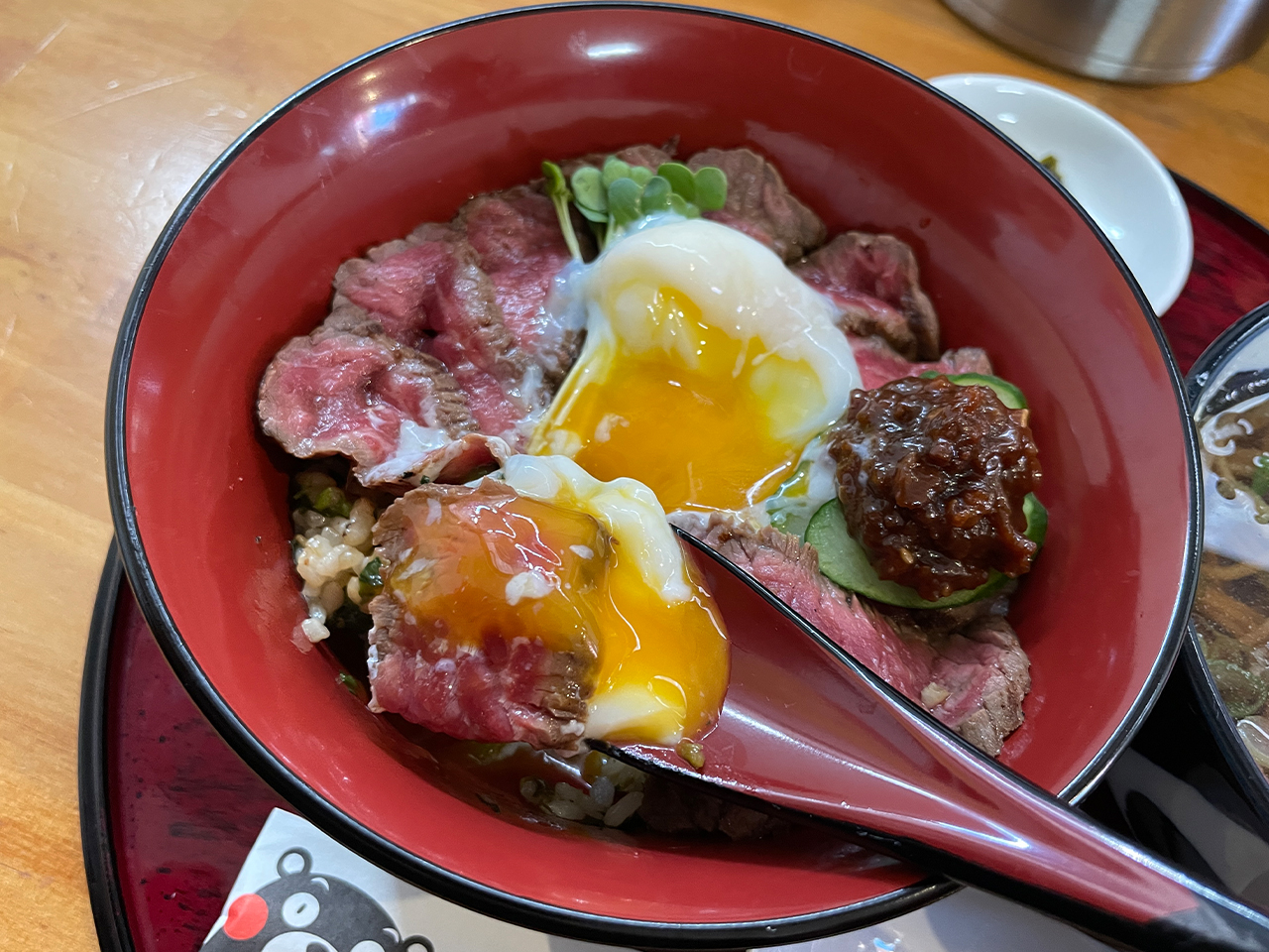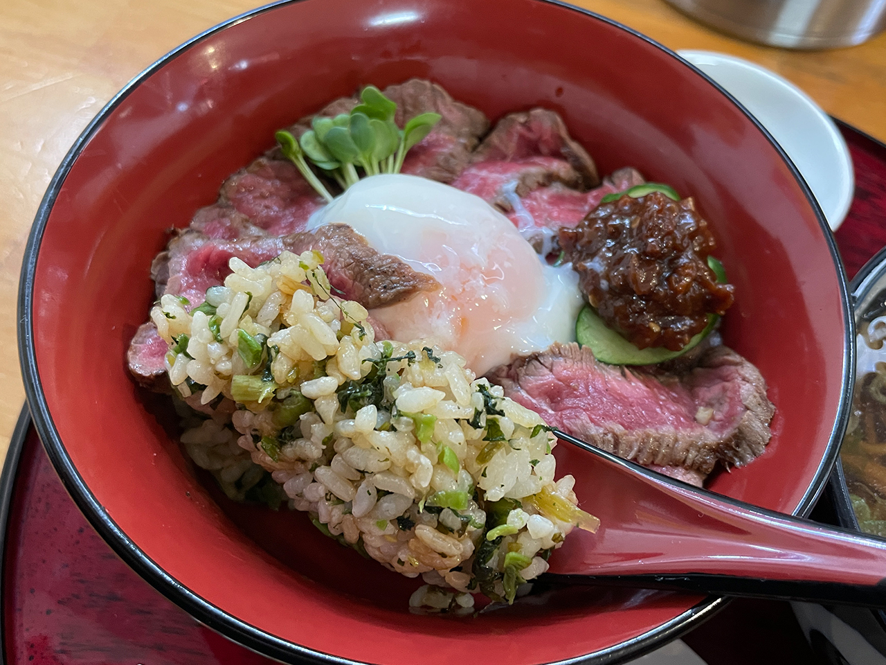 あか牛の赤身は柔らかくて旨味がしっかりしていて、真ん中にのった温泉卵を崩すと、肉の甘みと絡んでちょうどよくマイルドになります。