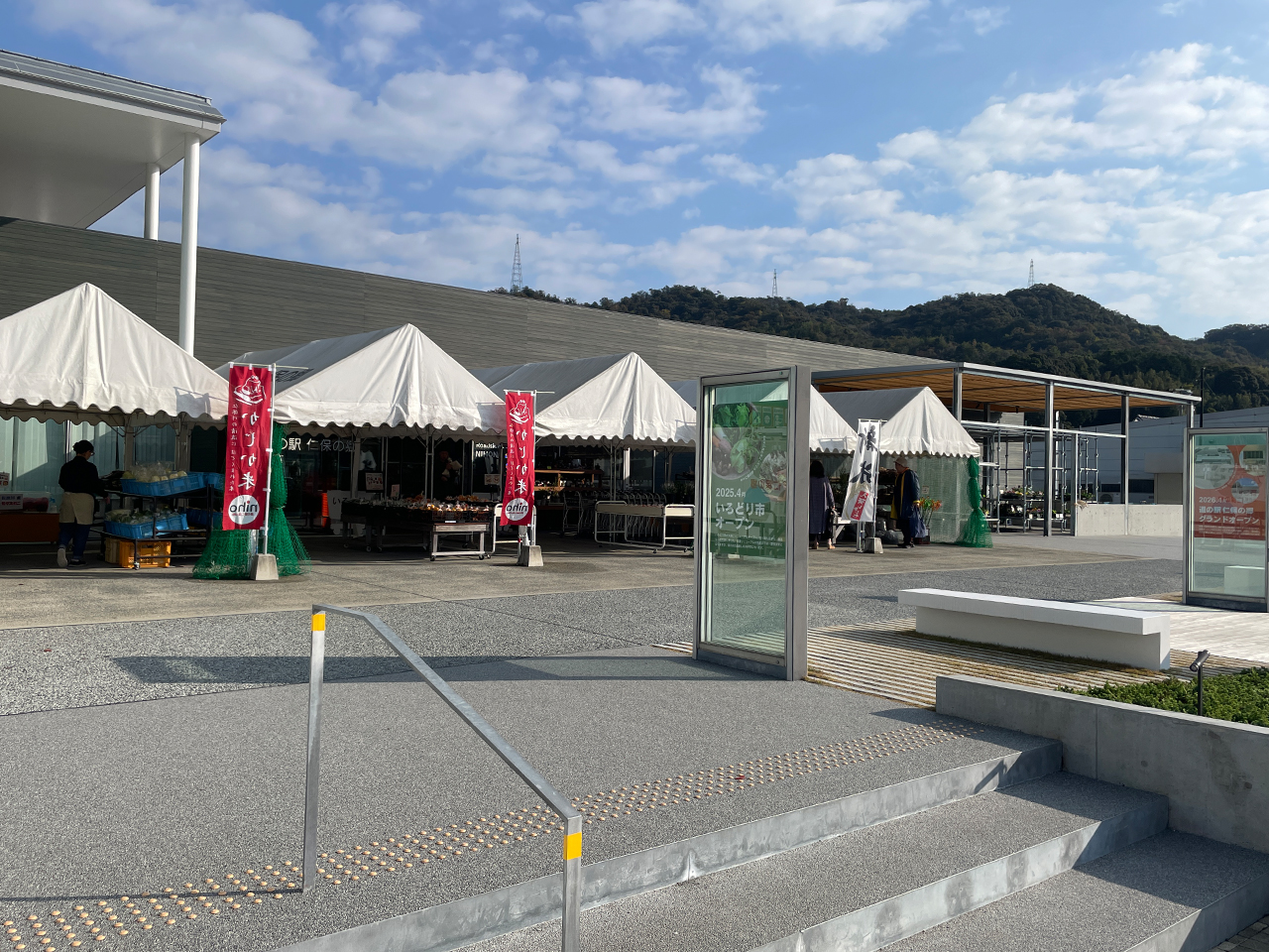 広場のほうではテントが並んでいて、地元の野菜や特産品がいろいろ並んでいました。天気も良くて、のんびり歩くにはちょうどいい感じです。