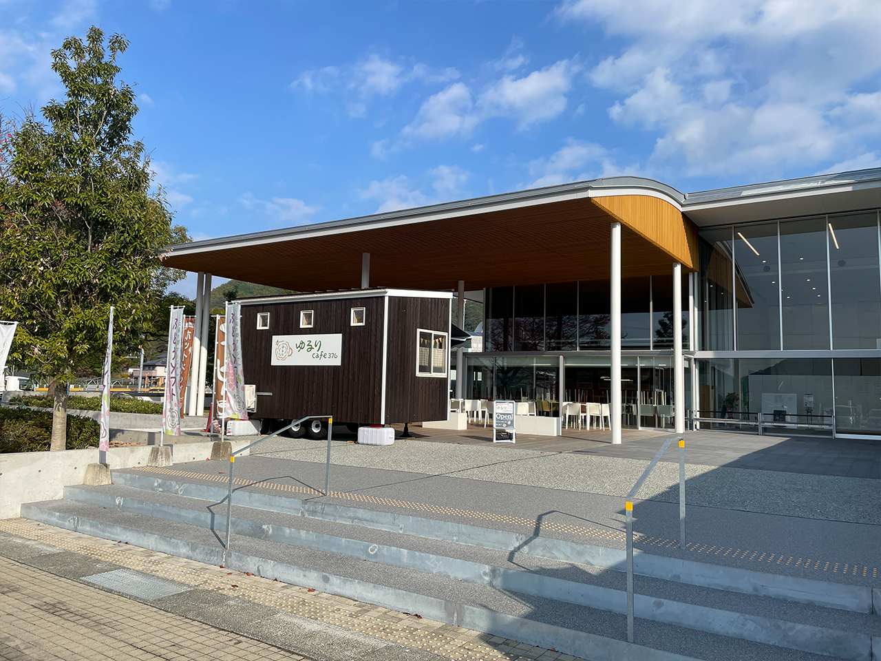 国道376号を走っていると、ガラス張りの明るい建物が見えてきます。思ったより現代的なつくりで、最初に見たときは少し驚きました。