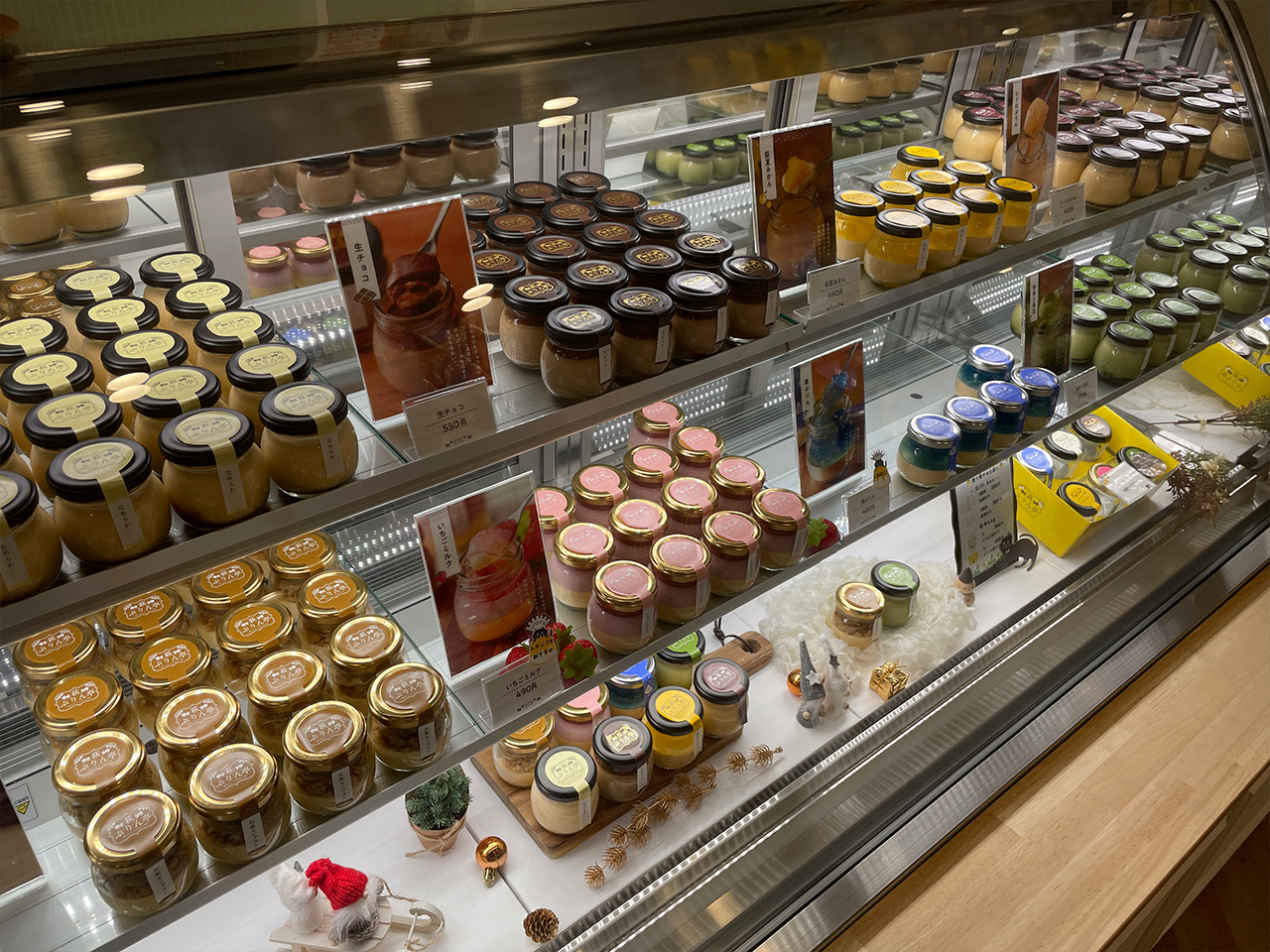 ショーケースには色とりどりのプリンがずらっと並んでいて、どれも可愛い瓶に入っています。