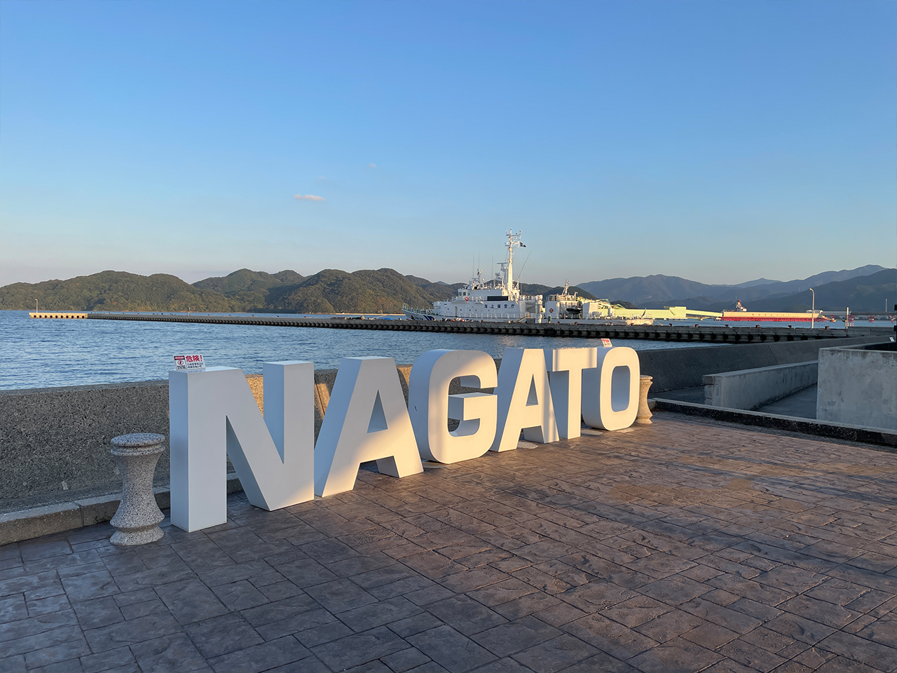 広い屋根付き通路「サンライズコリドー」を抜けると、海を背景にした“NAGATO”の大型モニュメントがあり、訪れた人たちの撮影スポットとして親しまれています。