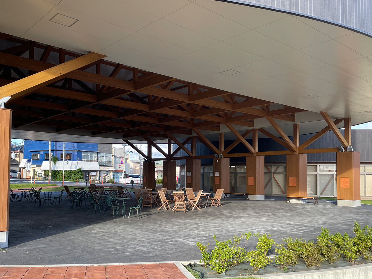 道の駅の周辺は昔ながらの商店街や住宅街が広がっていて、静かな日常の風景が残っています。そんな中にスタイリッシュな建物がぽんと現れるので、田舎町の中に現れた新しいランドマークのような存在です。天気の良い日は青空とのコントラストが美しく、写真を撮りたくなるスポットでした。